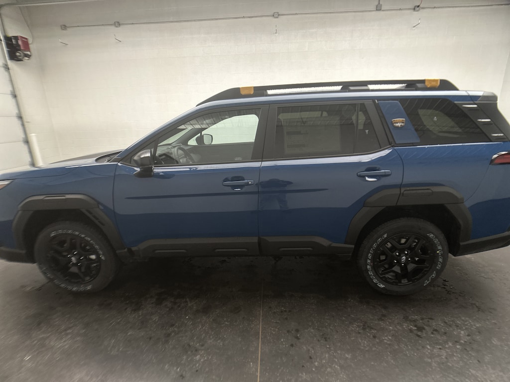 This is a brand new 2026 Subaru Outback Wilderness SUV that just arrived, finished in bold Geyser Blue with a Black Nappa leather-trimmed interior accented by copper stitching. With just 5 miles on the odometer, this Outback is completely untitled and includes the full factory warranty, giving you the confidence and excitement of being the very first owner.