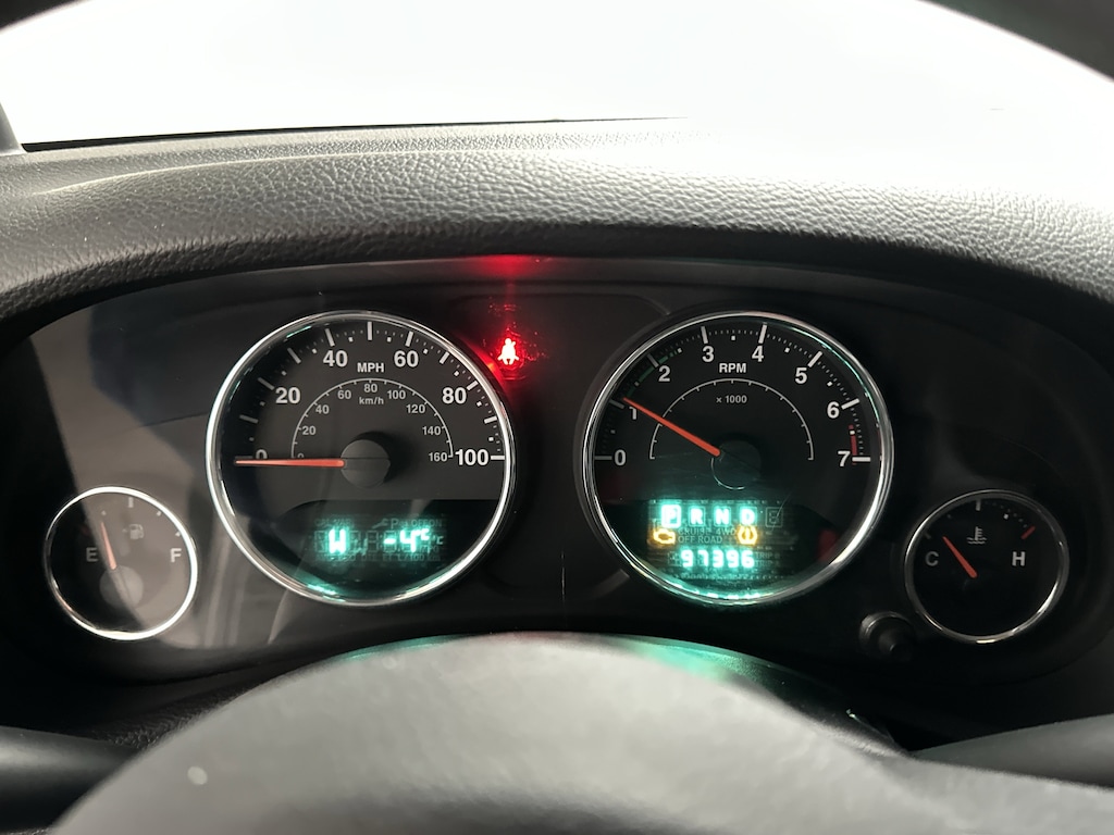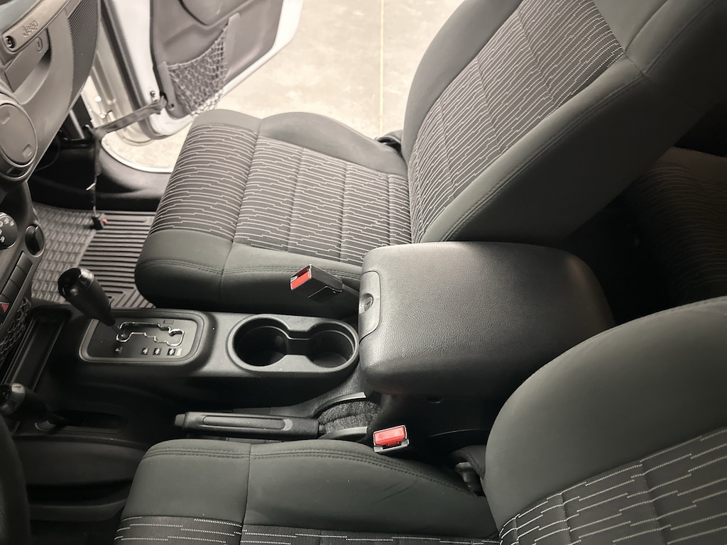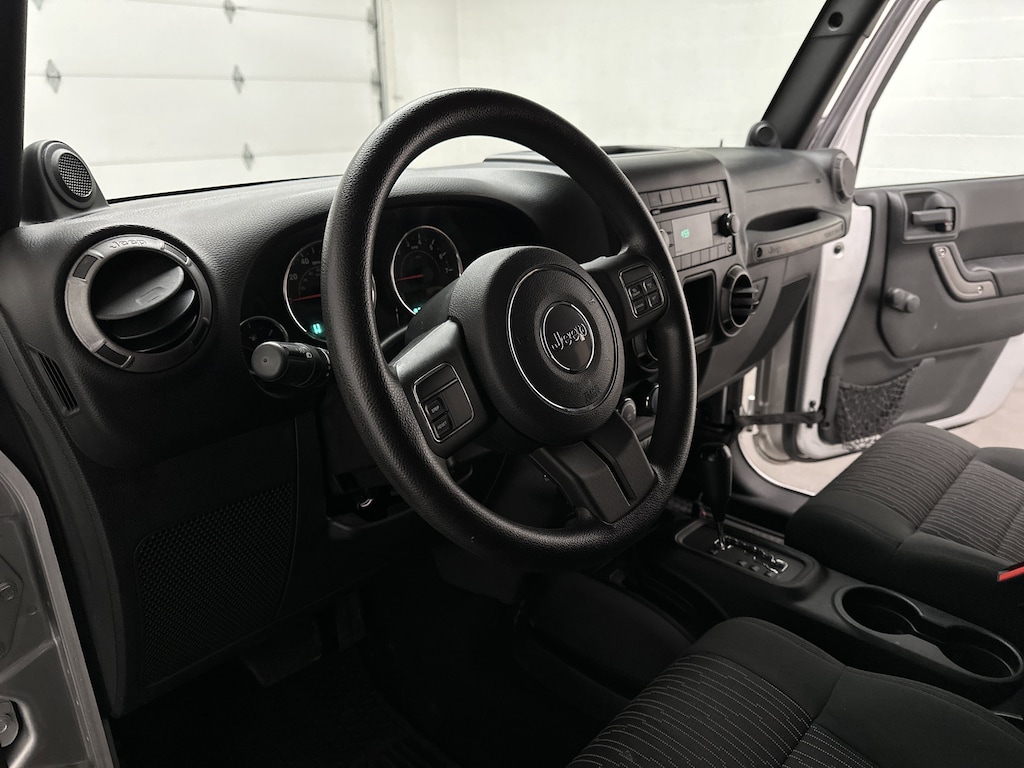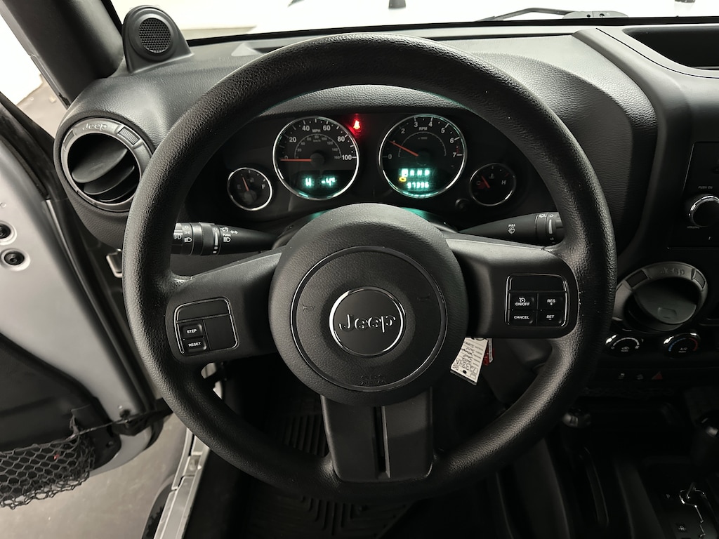 Slide into the driver's seat and you're immediately greeted by the upright, commanding view that Wrangler fans love. The cloth bucket seats are supportive and easy to settle into, whether you're cruising around town or bouncing down a back road. The premium instrument cluster with tachometer keeps everything clear and simple, while steering wheel-mounted audio controls let you adjust music or volume without taking your hands off the wheel.